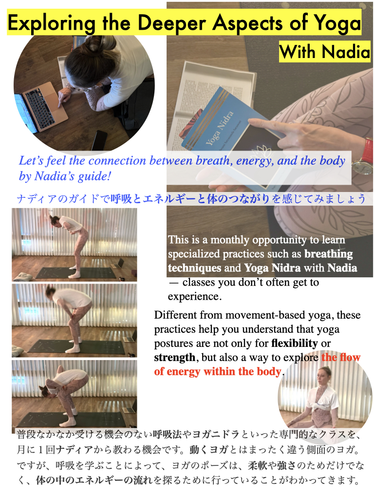 Let’s feel the connection between breath, energy, and the body by Nadia’s guide! ナディアのガイドで呼吸とエネルギーと体のつながりを感じてみましょう This is a monthly opportunity to learn specialized practices such as breathing technique... -