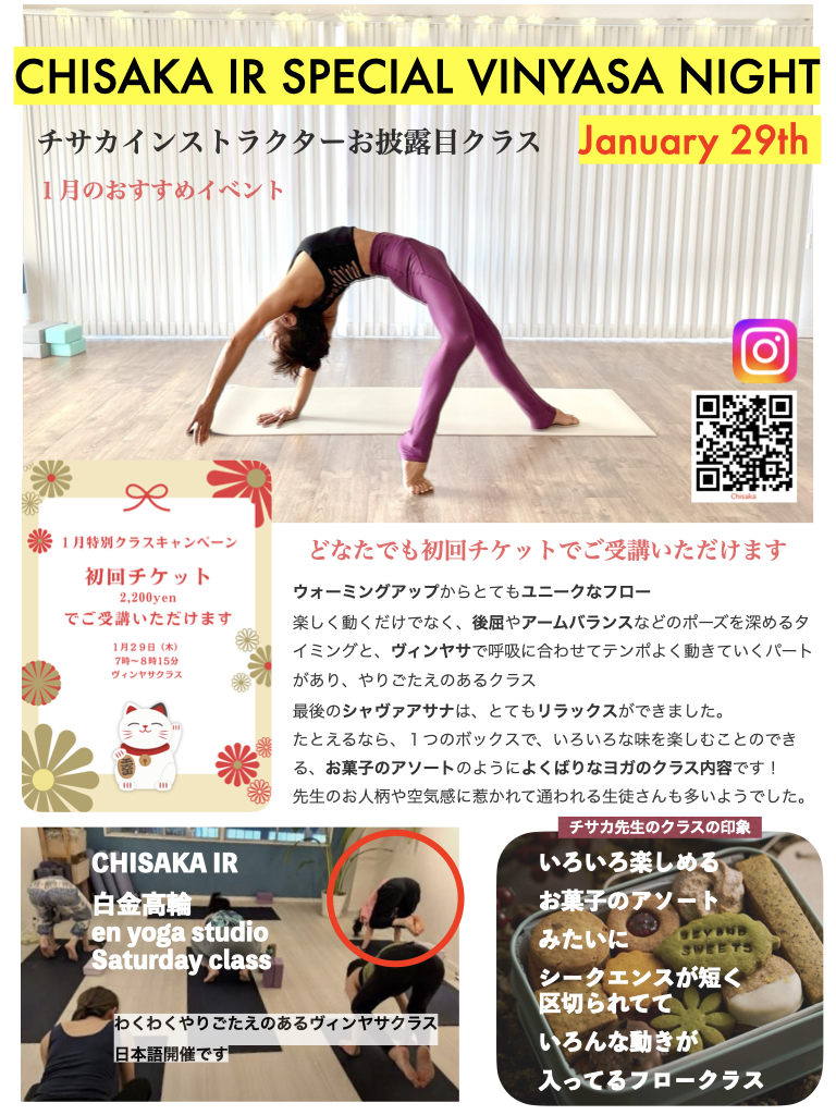 1/29(木)ベテランヨガインストラクターCHISAKA先生特別クラス 2026年1月01日 New York Style YOGAは、ヴィンヤサヨガがメインのプログラムです。 ヴィンヤサのクラスというのは、先生がオリジナルでシークエンスを作るので、講師の力量やセンスによってク... -