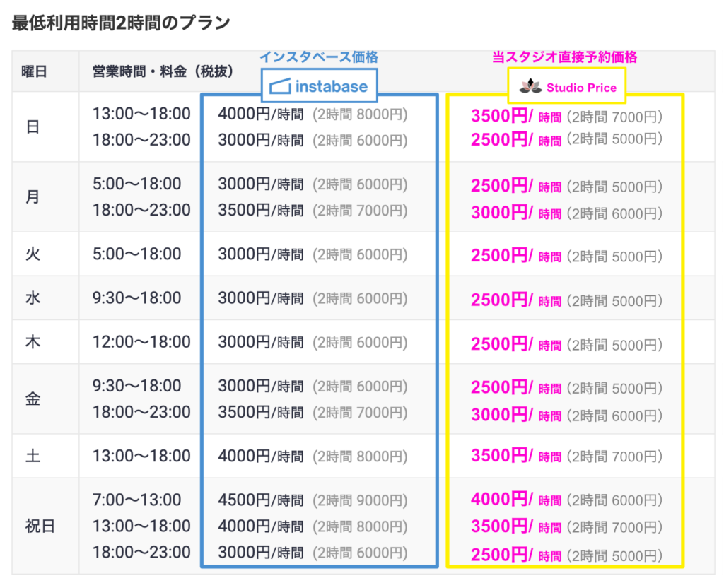インスタベースの料金設定より、1時間あたり500円ずつお安くなります。